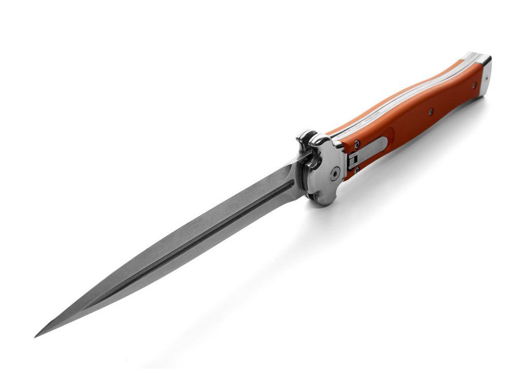 ZERO+ je moderní stiletto s pákovým mechanismem a je nejdelší dostupnou verzí pákového mechanismu! Má dýkovitou čepel z nerezové oceli N690 se saténovou povrchovou úpravou a masivní bolster z oceli AISI 430. Dvojitá pružina zajišťuje rychlejší chod a zaručuje delší životnost. Obrácená páka zajišťuje rychlé otevírání. Oranžová rukojeť z materiálu G10 má 3D texturu pro lepší úchop. Kapesní klip z nerezové oceli lze snadno sejmout a nahradit ocelovou záštitou.