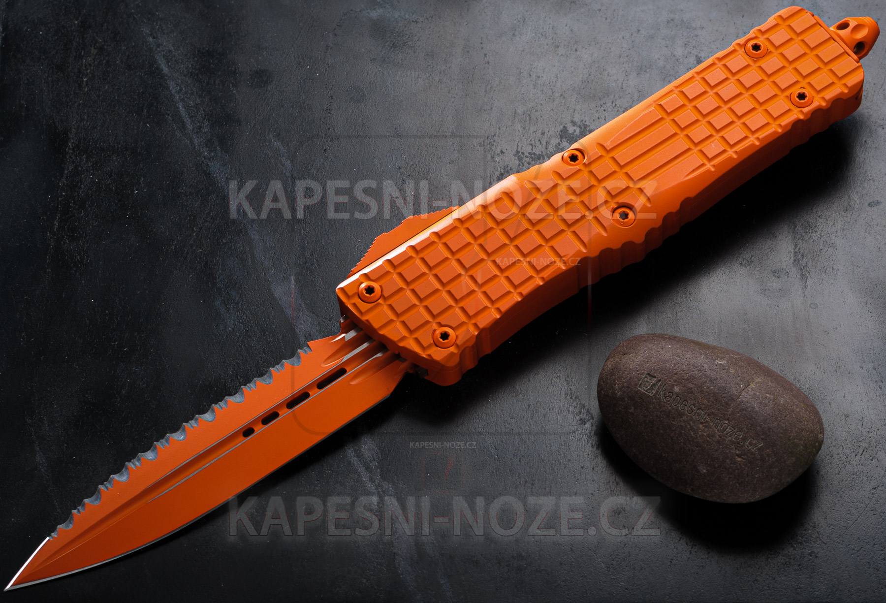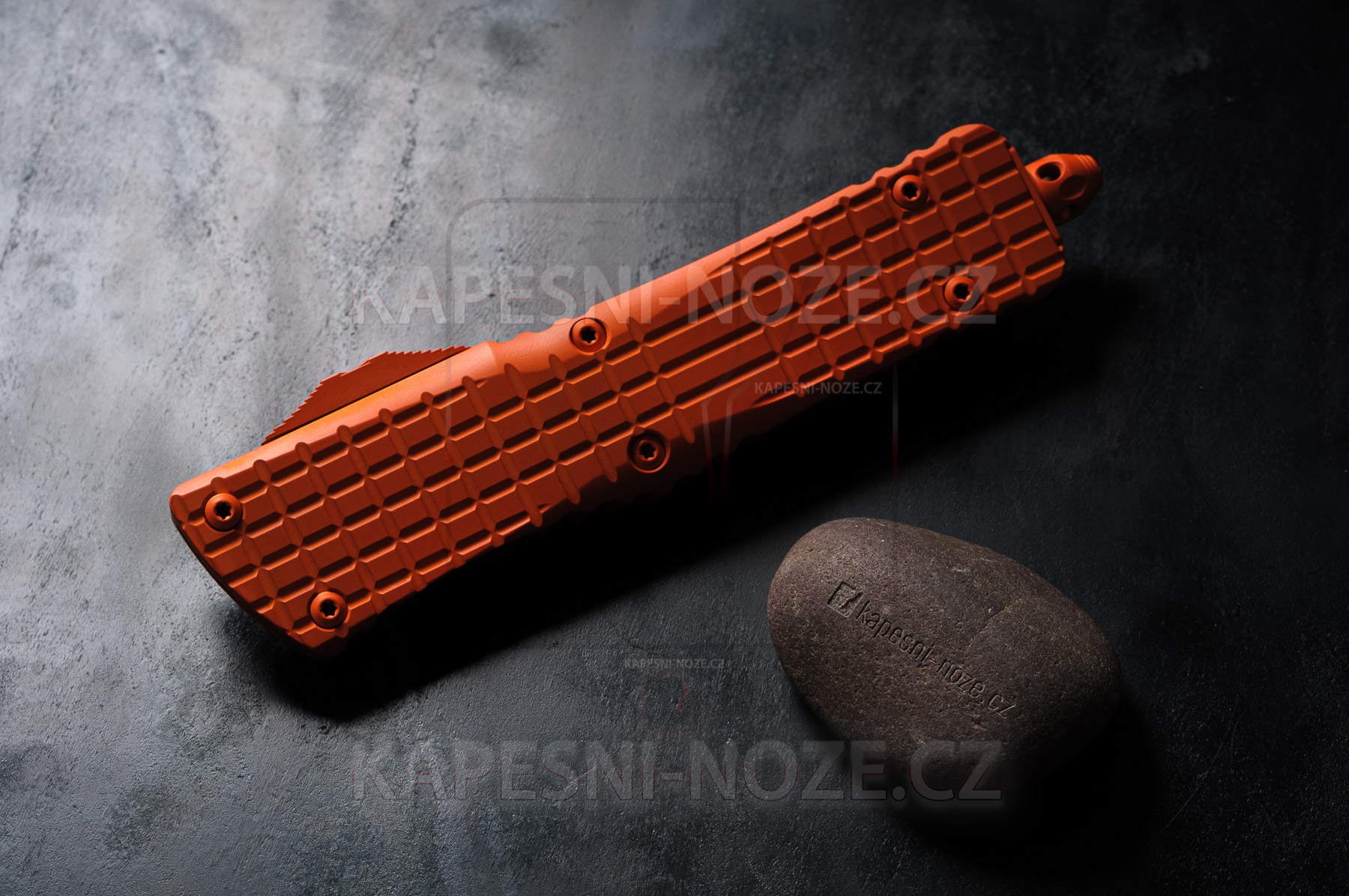 Luxusní oranžová edice automatického nože troodon, předem vystřelovaný dvoučinný nůž z produkce světoznámého Microtechu.
