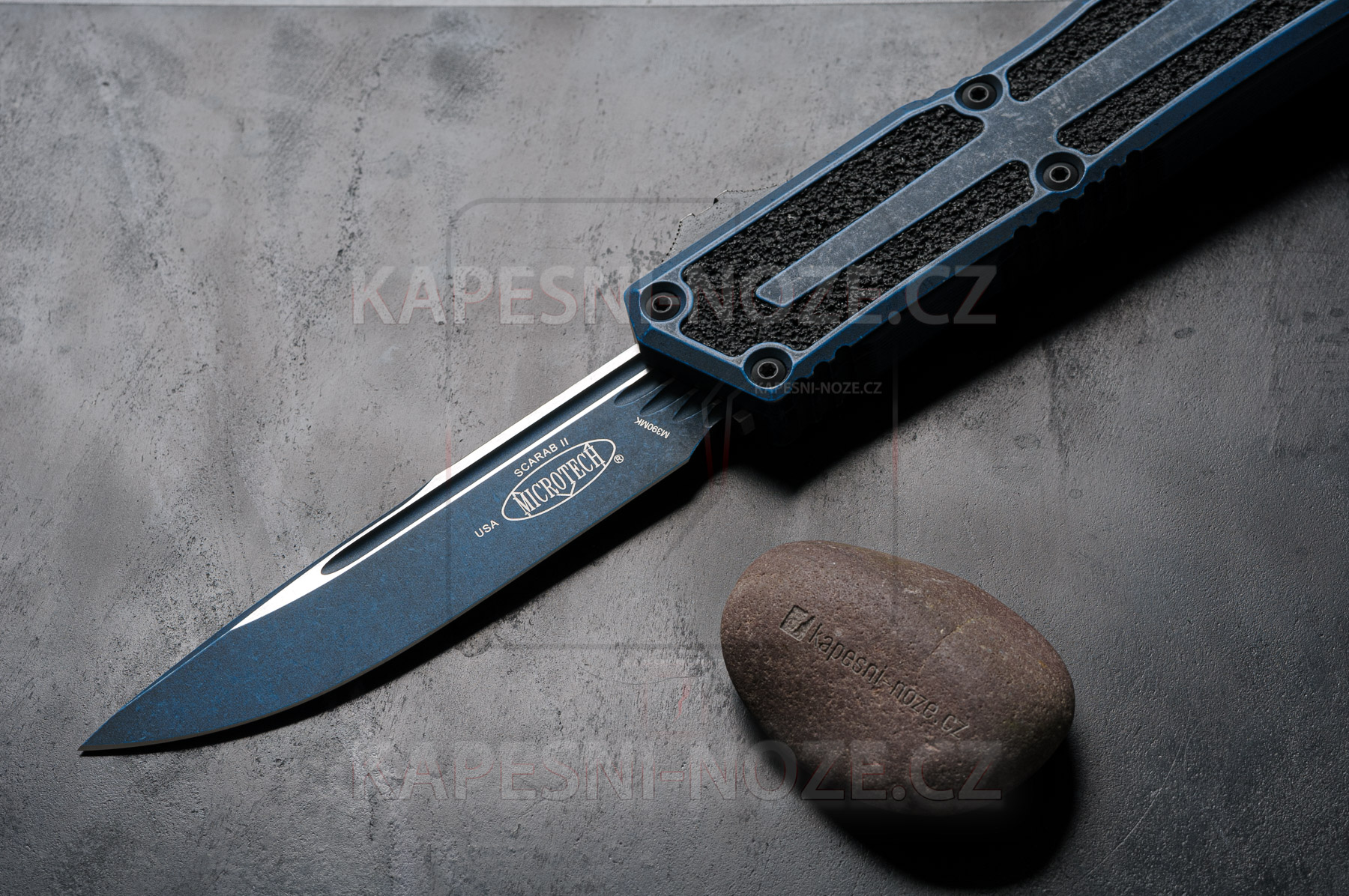 Modřená edice automatického nože Scarab 2, předem vystřelovaný dvoučinný nůž z produkce světoznámého Microtechu.