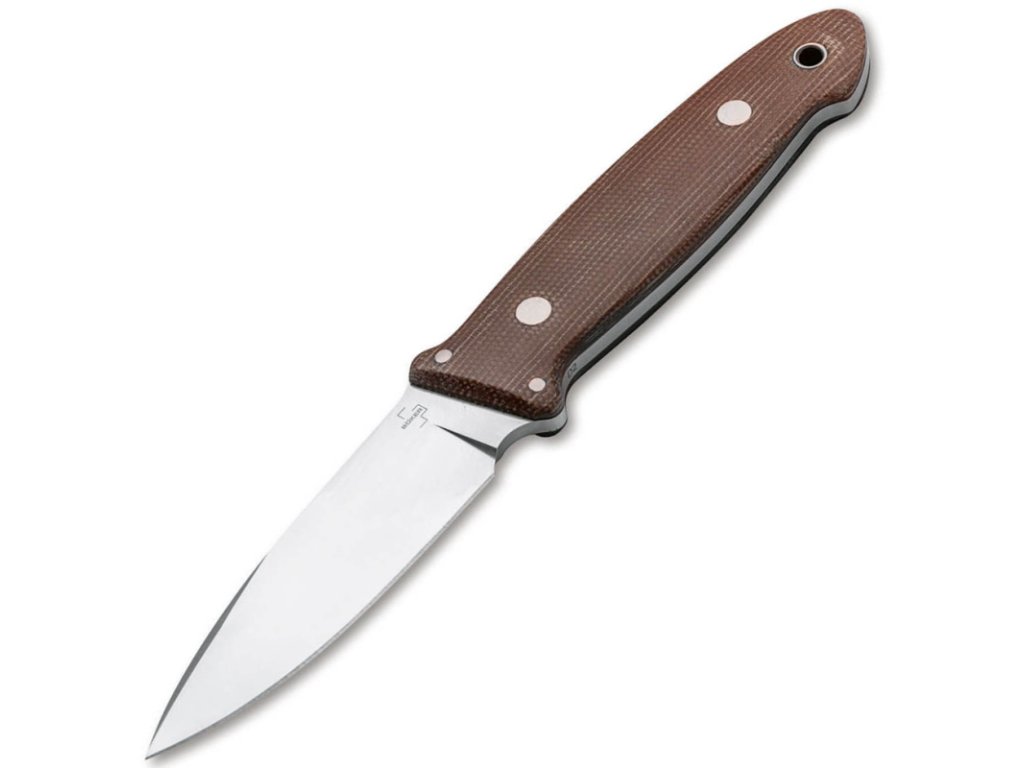 Nůž Böker Plus Cub Pro, který navrhl Lucas Burnley, přesvědčí jako lehký outdoorový nůž i při každodenním používání. Plochá broušená čepel je vyrobena z materiálu D2 a má jemnou saténovou povrchovou úpravu, zatímco mírně tvarované šupiny rukojeti konstrukce Vollerl jsou vyrobeny z hnědé Micarty. Barevný akcent dodávají červené vrstvy vláken G10 a nýty v barvě mědi. Se záchytným očkem na řemínek a kvalitním černým koženým pouzdrem.