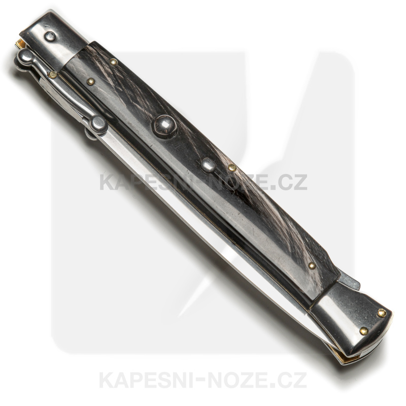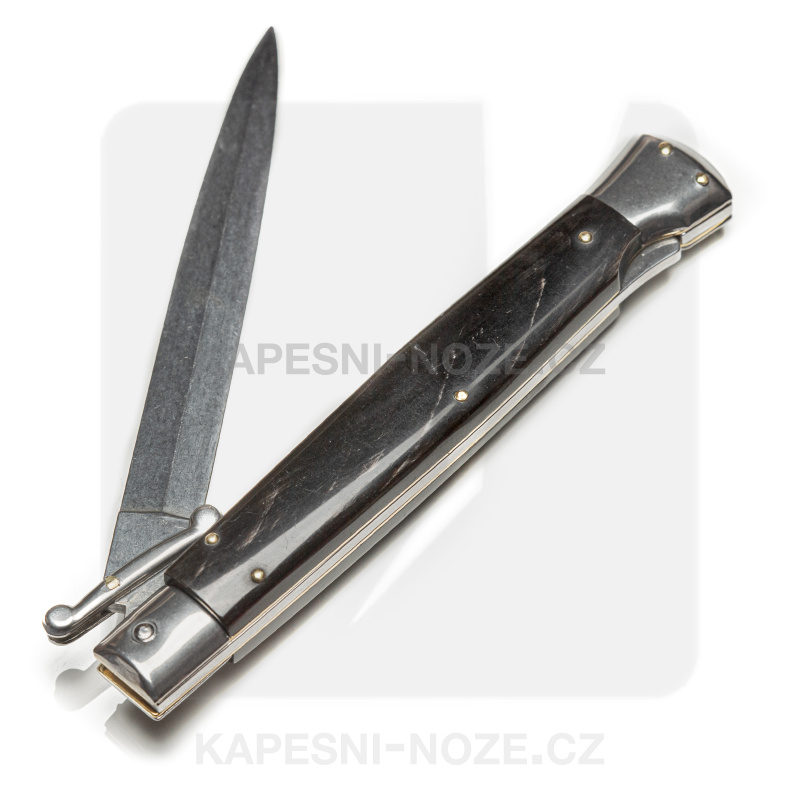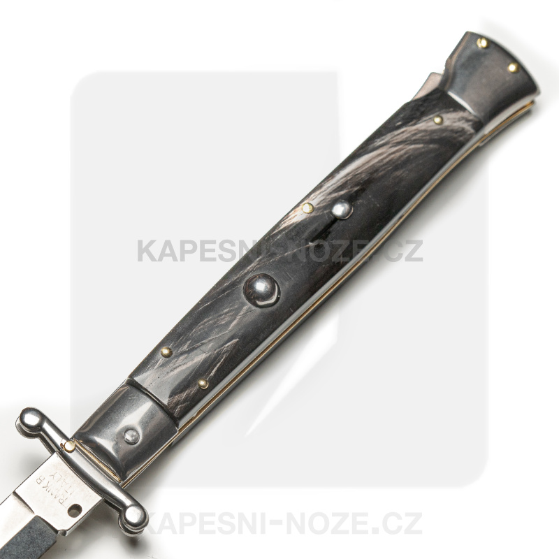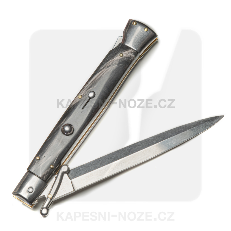 Ein einzigartiger traditioneller Stiletto, inspiriert von den originalen Frank Beltrame Italy Switchblades. Hier hat der Hersteller bestimmte Herstellungsfehler beseitigt und verbessert, so dass es ein zuverlässiges und präzises Messer in Bezug auf die Klingenfreigabe und die Robustheit in der offenen Position ist. Der Switchblade Guard ist mit einer kleinen Niete an der Klinge befestigt, die Liner sind aus Messing und die Klinge ist aus rostfreiem AISI 420 MA5M Stahl mit einer Härte von 56 HRC.
