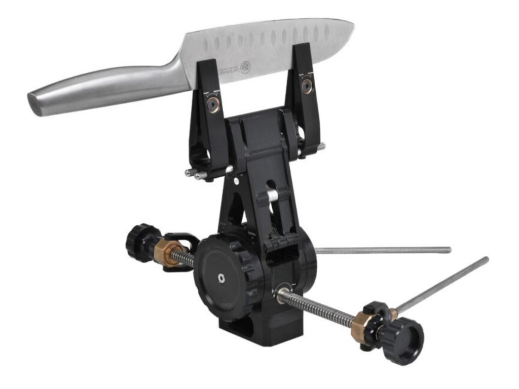 Der Benutzer profitiert von Variabilität, da die Klemmen auf Edelstahlstangen verschoben und je nach Länge oder Form des jeweiligen Messers eingestellt werden können. Kleine Klingen können mit beiden Klemmen gleichzeitig auf einem Satz Stangen geklemmt werden, was einen extrem festen Halt für Detailarbeiten gewährleistet. Die aus ENAW 7075 T651-Duraluminium gefrästen integrierten Körper bilden eine kompakte, stabile Plattform, auf der die Kraftübertragung beim Spannen gleichmäßig verteilt wird. Kugelförmige Bronzebuchsen in den Spannbacken gleichen den Anpresswinkel aus und verhindern seitliche Kräfte, wodurch die Klinge präzise und ohne Spannung aufliegt.