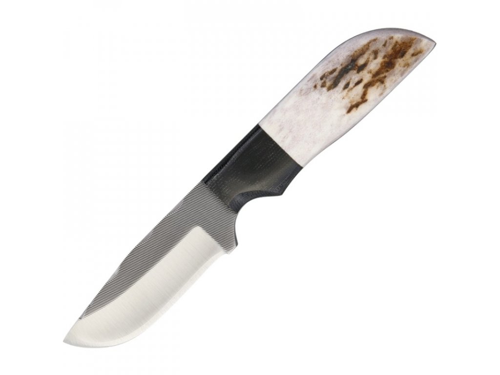 Gesamtlänge 19,5 cm. Klingenlänge 8,9 cm. Edelstahlklinge. Griff aus Elchgeweih und Micarta. Braune Lederscheide.