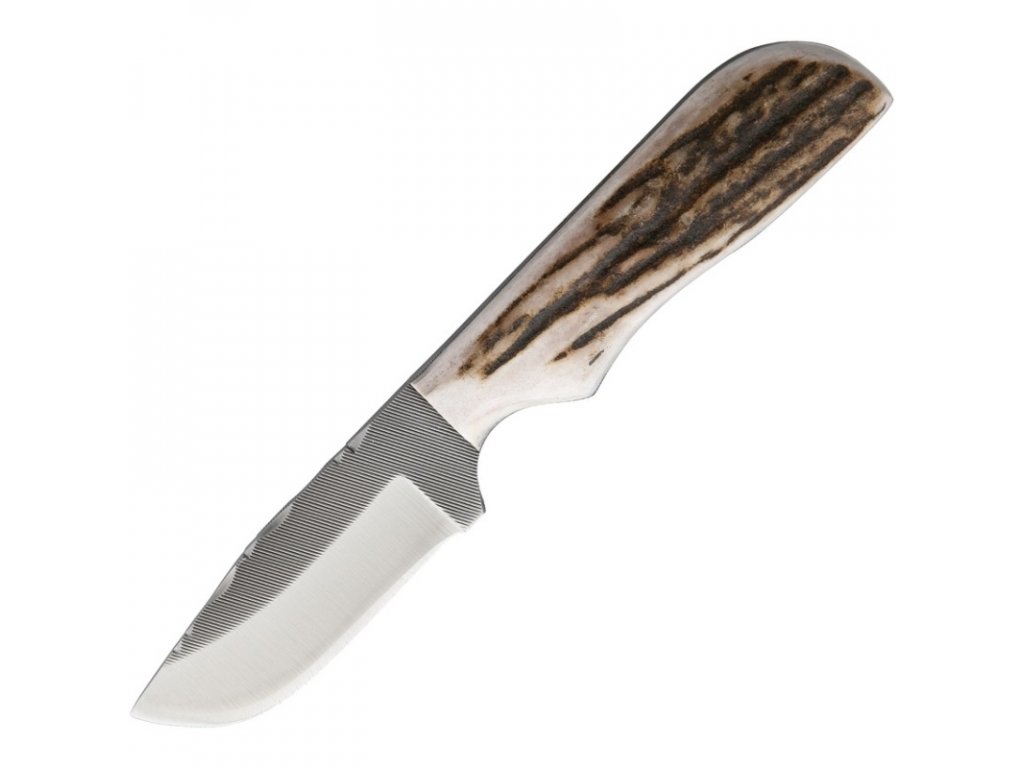 Gesamtlänge 19 cm. Klingenlänge 9 cm. Klinge aus Edelstahl, Griff aus Elchgeweih. Braune Lederscheide