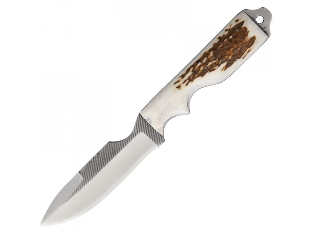 Gesamtlänge 23,5 cm. Länge der Klinge 11,5 cm. Klinge aus rostfreiem Stahl, Griff aus Elchgeweih. Mit Lanyard-Loch. Braune Lederscheide.