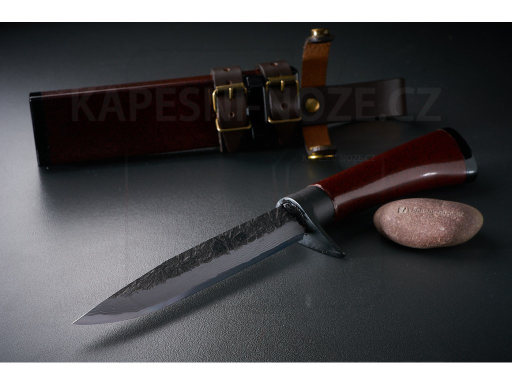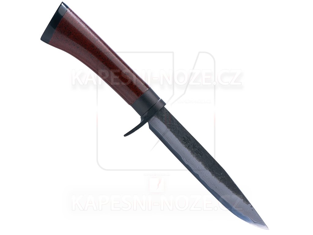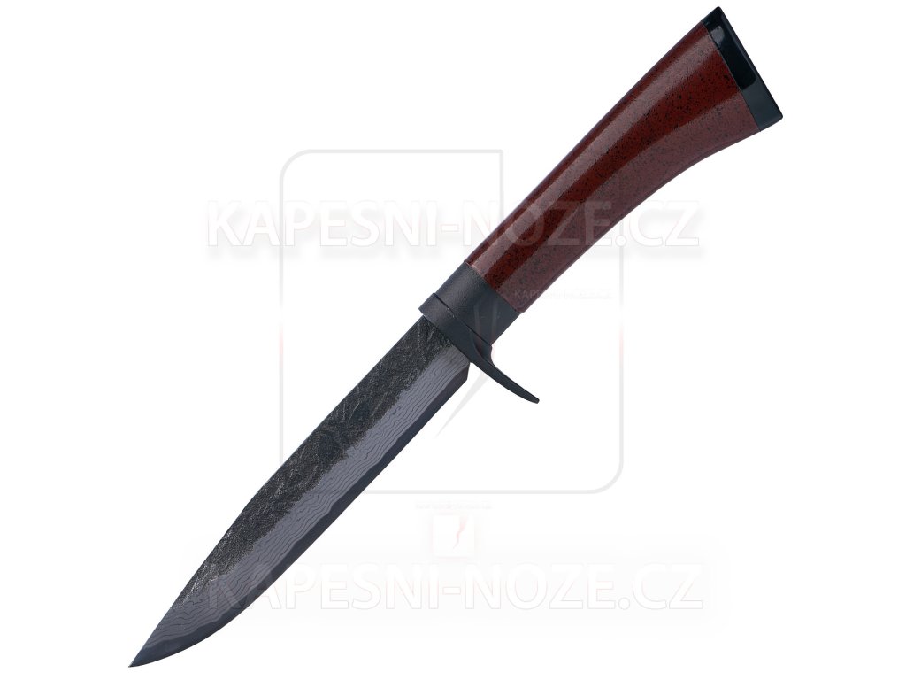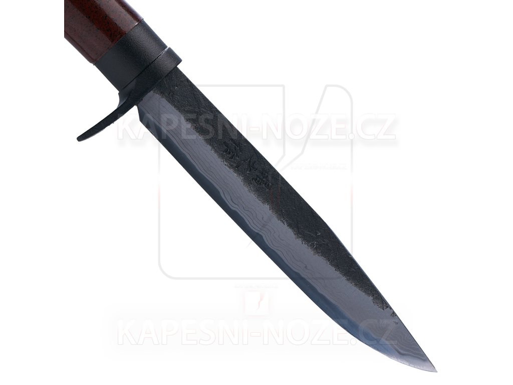 Der Griff wurde mit einem traditionellen Lack in rot-schwarzem Steinmuster versehen, der eine auffällige Ästhetik mit praktischem Holzschutz verbindet. Die Oberfläche wirkt glatt, bietet aber auch bei längerer Arbeit einen sicheren Griff. Ergänzt wird das Ganze durch einen schwarzen Tsuba-Ring, der die Klinge optisch vom Griff trennt und gleichzeitig die Sicherheit bei der Handhabung erhöht. Dieses Detail erinnert deutlich an die Konstruktion japanischer Schwerter und unterstreicht den Sammlerwert des Messers.