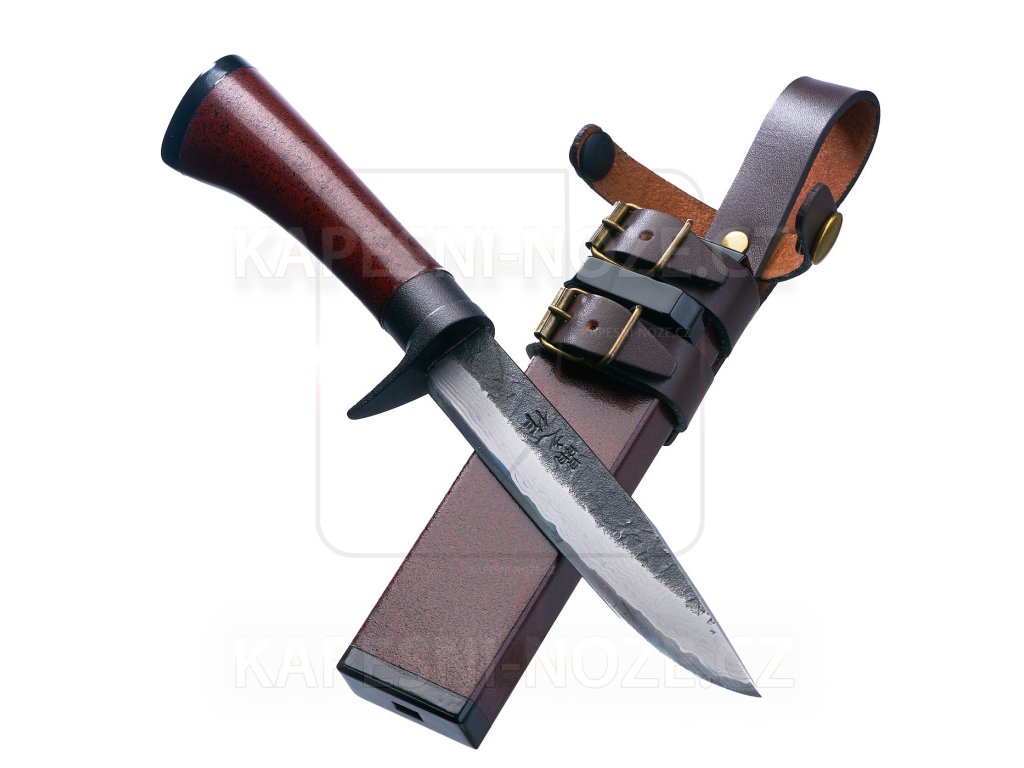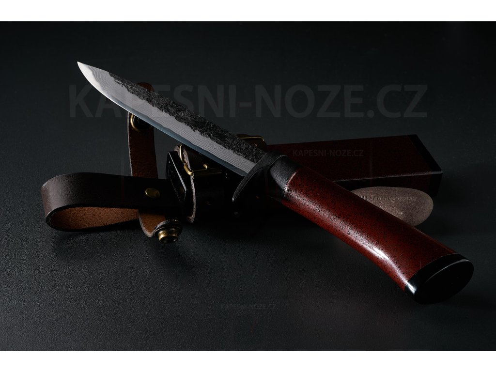 Zum Lieferumfang gehört eine lackierte Holzscheide mit einseitiger Oberflächenbehandlung im gleichen rot-schwarzen Steinmotiv. Die Scheide schützt die Klinge beim Transport, während ein Lederriemen in dunklem Schokoladenbraun ein bequemes Tragen und Aufhängen ermöglicht. Das Gesamtbild wirkt stimmig, handwerklich solide und spricht sowohl Liebhaber der japanischen Ästhetik als auch Nutzer an, die ein technisch interessantes, robustes Messer mit ausgeprägter Persönlichkeit und traditioneller Herkunft suchen.