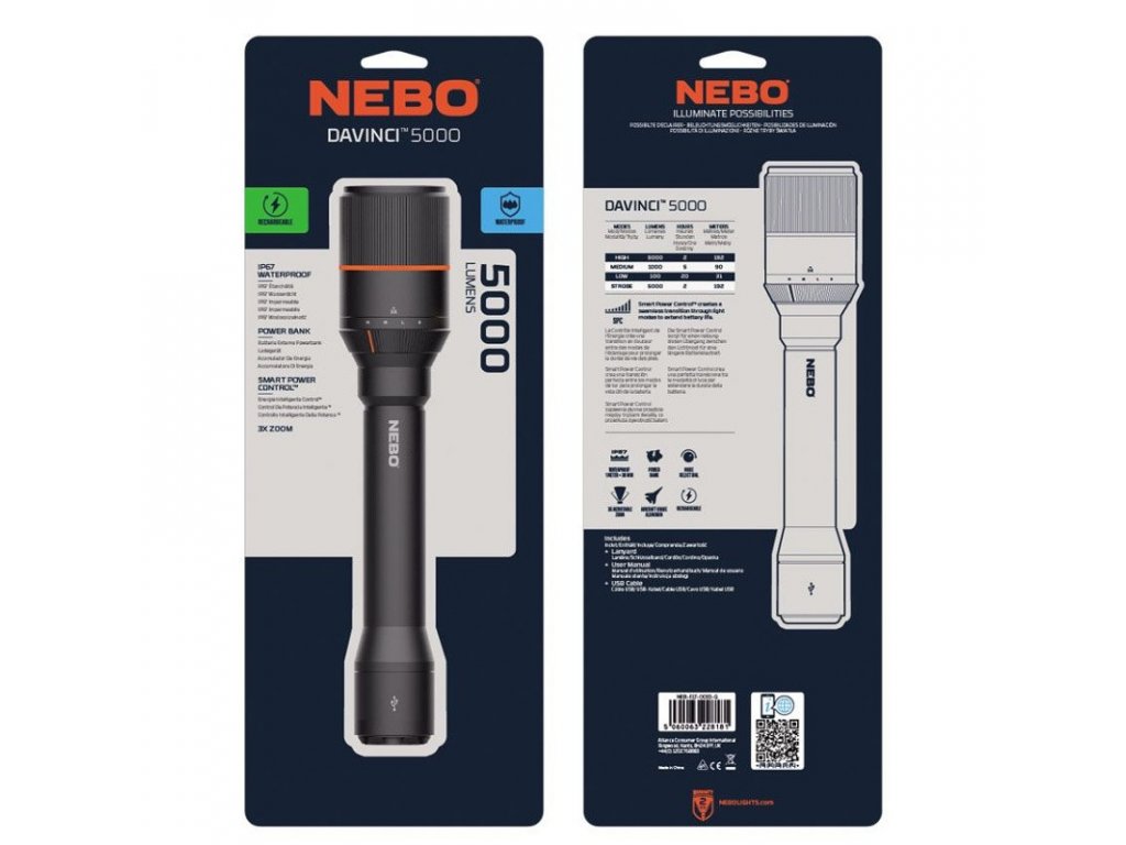 Die Davinci™ 5000 Lumen wiederaufladbare Taschenlampe von NEBO ist eine leistungsstarke, tragbare Taschenlampe mit 4 Lichtmodi, die auch als Powerbank zum Aufladen intelligenter Geräte fungiert. Die leistungsstarke LED in dieser Taschenlampe kann eine Entfernung von bis zu 192 Metern erreichen. Der mitgelieferte Akku ermöglicht eine Betriebsdauer von bis zu 20 Stunden zwischen zwei Aufladungen.