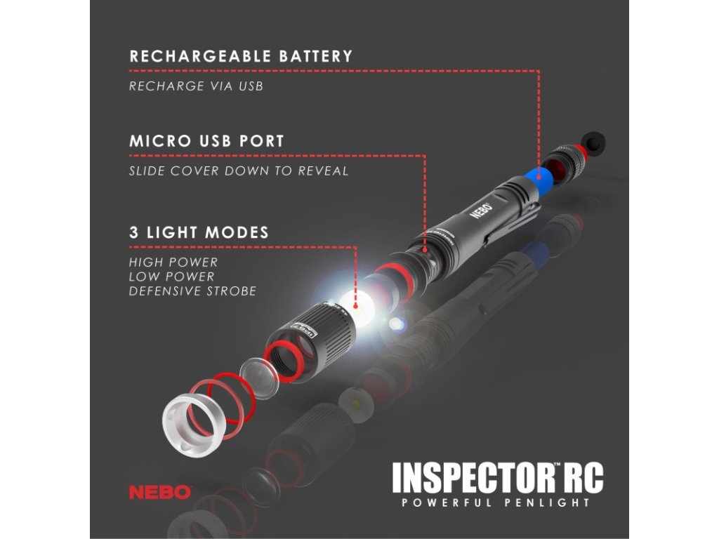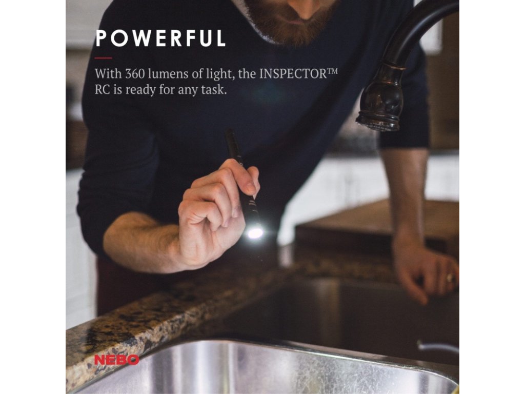 NEBO INSPECTOR RC ist eine professionelle 360 Lumen starke, wiederaufladbare und wasserdichte (IP67) Taschenlampe.