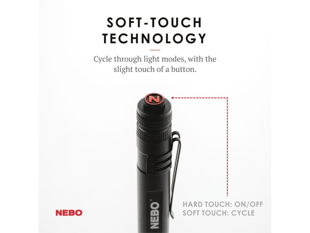 Zur Ausstattung gehören FLEX-POWER, abnehmbarer Stahlclip, 4-facher Zoom und 3 Lichtmodi (hoch, niedrig, Stroboskop). Die Soft-Touch-Technologie ermöglicht den sofortigen Betrieb bei ausgeschaltetem Licht mit einem leichten Tastendruck