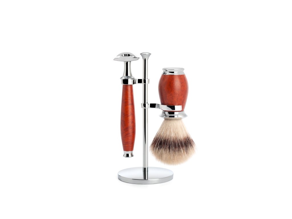 3-teiliges Rasierset, ohne Schale, Griff aus französischem Bruy-ére-Holz (weißes Heidekraut) - Silvertip Fibre Rasierpinsel, Größe M, Kopfdurchmesser 21 mm - klassische Klinge - glatte Rasur - Metallständer, verchromt Liebhaber von Qualitätspfeifen oder -intarsien schätzen dieses Wurzelholz schon seit vielen Jahren. Die wenigsten wissen jedoch, dass das Bruyere-Holz aus der Erika-Pflanze entstanden ist, die ausschließlich im Mittelmeerraum vorkommt. Um das lebende Holz für die Herstellung von Rasiermessern und Bürsten zu verarbeiten, müssen die Knollen zunächst gekocht werden. Erst jetzt erhält das Holz seine schöne rötliche bis braune Farbe. Nur die Teile des Materials, die makellos und ohne Risse sind, werden mit der nötigen Sorgfalt weiterverarbeitet: fein geschliffen, von Hand gebeizt, gewachst und poliert. Das daraus resultierende Produkt ist ein kostbares Unikat. Ohne Chrom würde die Welt einen Großteil ihres Glanzes verlieren. Deshalb verwenden wir es für unsere Rasierprodukte und deshalb zeigt es auch hier seine besten Eigenschaften. Die Produkte sind korrosionsbeständig, haben eine sehr lange Lebensdauer und ein luxuriöses Aussehen. Im Kontrast mit anderen hochwertigen Materialien schaffen ihre Farben und Formen das perfekte Werk. Rasierpinsel - Silvertip Fibre Hochwertige synthetische Fasern sind die erste unserer weltweiten Erfindungen. Wir bieten Ihnen synthetisch hergestellte Spitzenqualität, deren Eigenschaften denen von teuren natürlichen Dachsborsten sehr ähnlich sind. Die meisten Benutzer behaupten sogar, dass diese Qualität bessere Leistungseigenschaften bietet als natürliche Materialien. Silvertip Fibre ist an der Spitze sehr weich, aber in der Mitte etwas stabiler im Vergleich zu Naturborsten. Diese Eigenschaften sorgen für ein angenehmes, weiches Gefühl auf der Haut, wenn der Schaum aufgetragen wird. Für den täglichen Gebrauch sind diese Borsten im Vergleich zu Naturborsten weniger empfindlich, da sie schneller trocknen und Rasierseifen und -cremes besser widerstehen. Vollständig vegane Fasern sind auch etwas einfacher zu verwenden als Naturfasern, da sie aus einer kleinen Menge Rasierseife oder -creme einen besonders cremigen und dicken Schaum erzeugen. Die halbrunde Form des Rasierpinselkopfes lässt sich ideal von Hand einstellen. Die feinen Spitzen müssen daher nicht getrimmt werden und die natürliche Weichheit der Fasern bleibt erhalten. Scherkopf - für eine glatte Rasur Seit Generationen gilt der Rasierer als stilvoller Klassiker, der das Gesicht mit perfekter Präzision rasieren kann. Für viele ist es das Beste, was es geben kann. Und es ist auch der ideale Stil für Mühle. Obwohl das offene Rasiermesser anfangs etwas Respekt abverlangt, wird es bereits nach kurzer Bekanntschaft von einer ruhigen Hand zu einer sehr glatten Rasur mit dauerhaften Ergebnissen geführt. Im Gegensatz zu modernen Klingensystemen bewegt sich der Scherkopf nicht. Die Klingen werden nur durch Abschrauben des Kopfes gewechselt. Die Rasur mit unseren sicheren Rasiermessern sollte zunächst ohne Druck auf die Haut erfolgen. Eine erste Rasur ist oft ausreichend und eine zweite Rasur in die entgegengesetzte Richtung ist nicht notwendig. Die Haut muss zu jeder Zeit ausreichend gespannt sein. Rasiermesser in Standardgröße können Sie hier oder überall auf der Welt kaufen.Seien Sie der Erste, der einen Beitrag über diesen Artikel schreibt.
