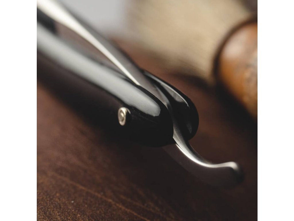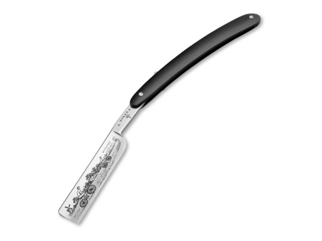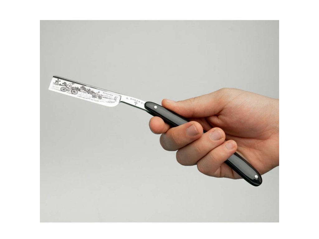 Die 5/8 Zoll breite Klinge aus haltbarem Kohlenstoffstahl ist mit einem abgestuften Knauf versehen und repräsentiert die Vielseitigkeit, Robustheit und Geradlinigkeit klassischer Fahrräder, die mit einer soliden Ausrüstung für jedes Terrain gerüstet sein mussten - das Böker Bicycle Race steht also in Sachen Rasur in nichts nach. Das edle Satin-Finish und die einseitige Zahnung vervollständigen das heroische Profil des Rasiermessers. Der kugelförmige Griff aus schwarzem Kunststoff wird mit zwei neusilbernen Nieten modern veredelt.