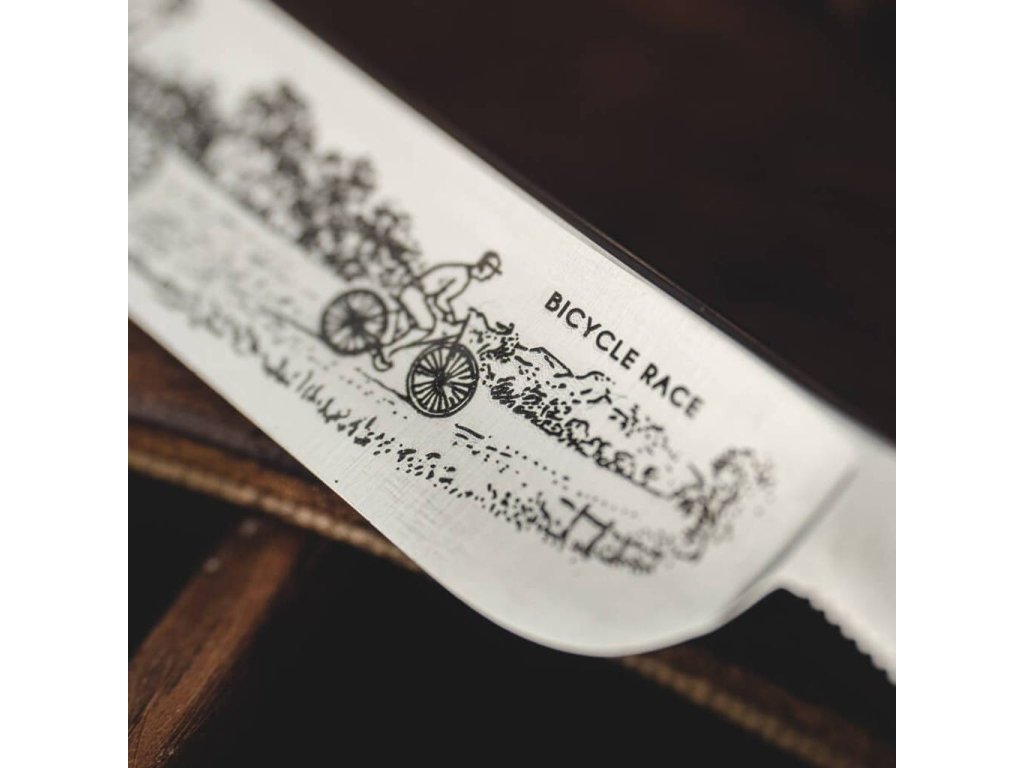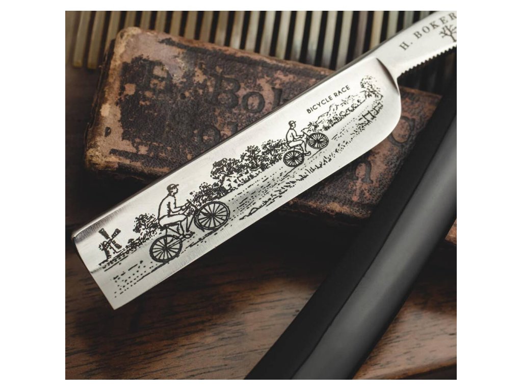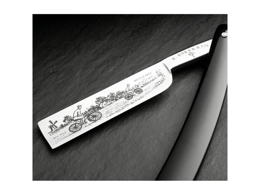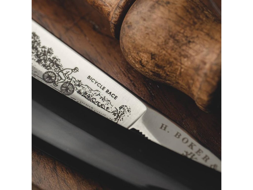Boker bringt ein Stück Geschichte zurück und präsentiert das Böker Bicycle Race als Neuauflage des gleichnamigen Rasiermessers, das um 1900 erschien. Das Blatt des auf 300 Stück weltweit limitierten Sondermodells zeigt ein klassisches Fahrradrennen in einer malerischen Landschaft nach historischem Vorbild. Fast die gesamte Klinge ist mit einem sorgfältig restaurierten, in mehreren Schichten gelaserten Motiv ausgefüllt, und die Klinge ziert das historische Logo von H. Böker & Co.