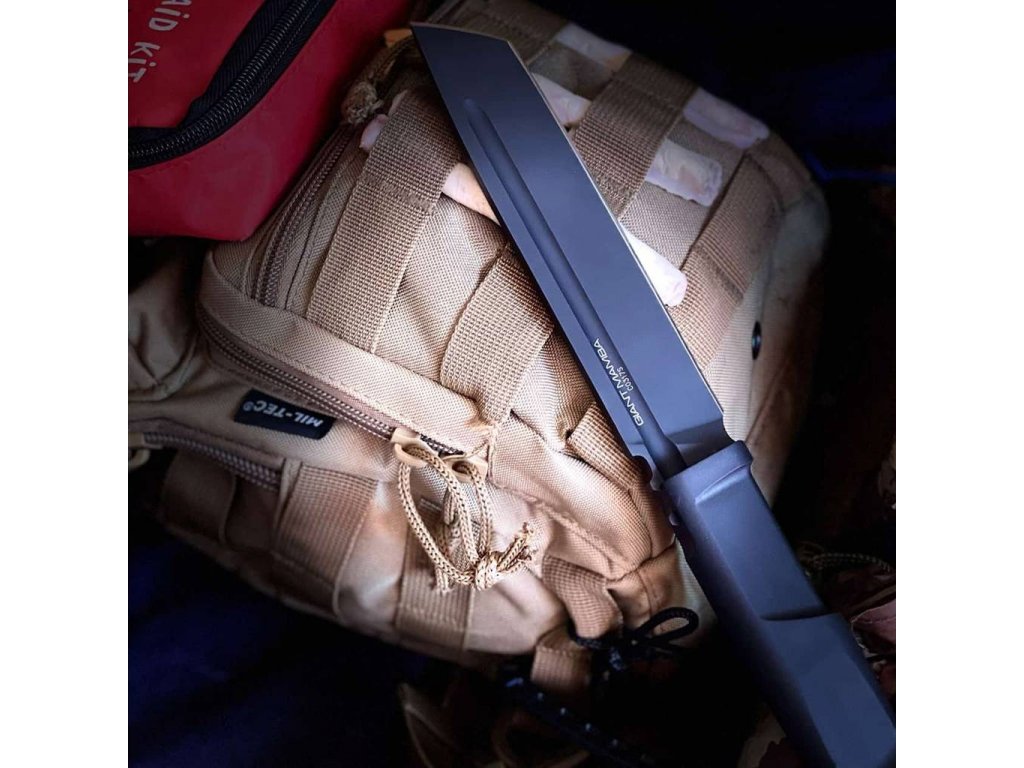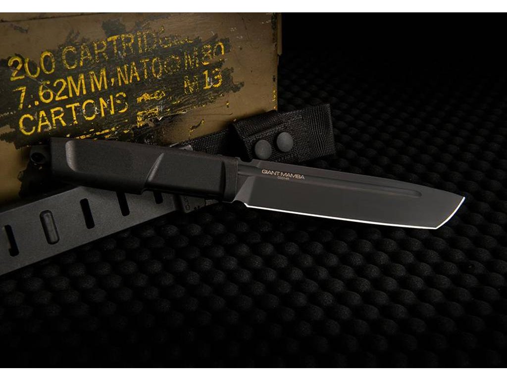 Das Giant Mamba hat eine 6,3 mm starke Tantoklinge aus Böhler N690 Stahl mit einer Härte von 58 HRC. Der Forprene-Griff sorgt für einen sicheren Halt unter allen Bedingungen. Die spritzgegossene, M.O.L.L.E.-kompatible Nylonscheide ist schlagfest, verfügt über ein stoßdämpfendes System, das ein Klappern der Klinge verhindert, eine gummierte Schenkelschlaufe, die ein Verdrehen verhindert, und eine Rückhaltesperre, die durch einfaches Ziehen des abzugsähnlichen Hebels gelöst werden kann. Die neue Messerserie minimiert die Dicke und den Platzbedarf, ohne Abstriche bei der Haltbarkeit und Sicherheit zu machen.