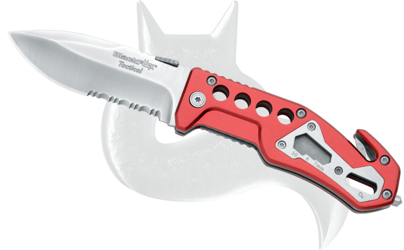 Qualitätsmesser für Rettungskräfte. Inklusive halbgezahnter Klinge, Gurtschneider, Glasbrecherspitze, Schraubenschlüssel zum Lösen von Muttern, Schlüssel zum Verschließen von Luftflaschen.