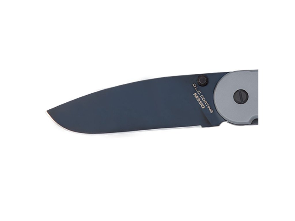 Die Klinge hat einen flachen Schliff und einen extrem starken und haltbaren Drop Point; beschichtet mit einer kohlenstoffbasierten DLC-Beschichtung (Diamond-Like Carbon), die sie extrem widerstandsfähig gegen Abrieb und chemische Aggression macht.