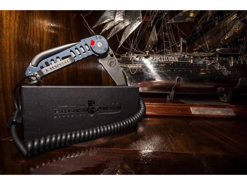 Messer für den Einsatz auf Yachten und in der Schifffahrt. Die Klinge hat einen flachen Schnitt für breitere Unterstützung beim symmetrischen Schneiden. Die Spitze ist stark und langlebig, seine Tanto-Form bietet eine größere Durchdringung und einen sauberen, präzisen Schnitt. Das Stone-Wash-Finish eignet sich für den Einsatz im Meer. Der eloxierte Aluminiumgriff hat das "taktische" Design, das auch bei anderen BF-Modellen zu finden ist. Das konzentrische Kreismuster liegt besser in der Hand, spart Gewicht und ermöglicht das Abspülen des Griffs von Salz und organischen Stoffen. Eine Rille in der Mitte des Griffs dient als Schlüssel. Das Messer verfügt außerdem über eine verriegelbare 7 cm lange Marlspitze mit Schnurbefestigung. Die Einführung des BF2 V fand auf dem Ausbildungsschiff Amerigo Vespucci statt.