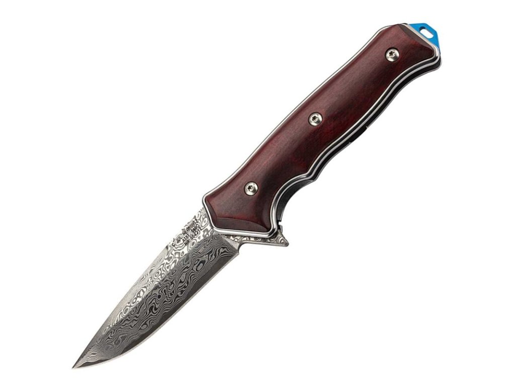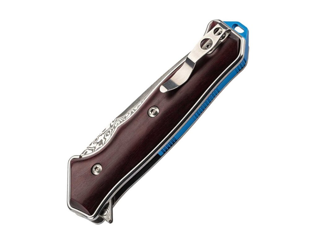 Großartige Materialien und hochwertige Verarbeitung vereinen sich in diesem Herbertz Einhandmesser. Die wunderschön gezogene, 67-lagige Damastklinge hat einen Kern aus AISI 440C Stahl und kann durch das Zusammenspiel von Flipper und kugelgelagerter Klingenachse elegant in Arbeitsposition gebracht werden. Die sauber verarbeiteten Edelstahlbacken werden von einem blau eloxierten Aluminium-Abstandshalter gehalten und verfügen über eine zuverlässige Sicherung. Maßgefertigte Skalen aus rotem Sandelholz und ein Taschenclip aus Edelstahl vervollständigen die großartige Ausstattung.