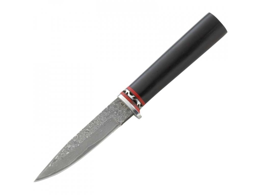 Krásný nůž s pevnou čepelí vyrobený z damascenské oceli o 35 vrstvách. Luxusní tmavé dřevo vystihuje elegantnost tohoto kousku. Rukojeť má v přední části dva červené kroužky G10 vyplněné ozdobným prstenem z nerezové oceli. Dodáváno včetně černého koženého pouzdra a dekorativní dárkovou krabičky.