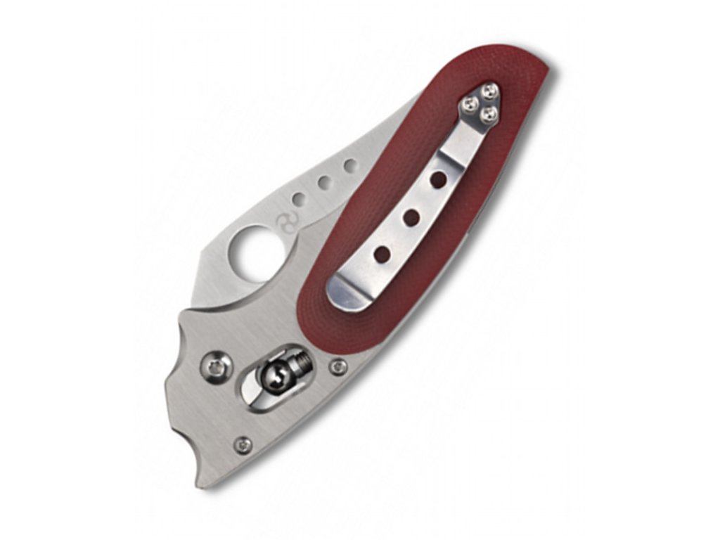 Als Hommage an Viele ist es uns eine Ehre, dieses klassische Modell in der limitierten Edition Sprint Run mit einer hohlgeschliffenen VG-10 Klinge, Volltitanbeschalung, geformten roten G-10 Beschalungen und einem Taschenclip auf der rechten Seite mit einem Flip-up-Griff wieder aufleben zu lassen. Wie alle Entwürfe von Viele weist auch dieses Messer sein charakteristisches Drei-Loch-Muster in der Nähe des Klingenrückens auf.