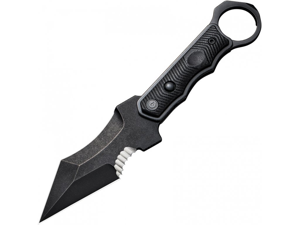 Orthrus is named after a monstrous two-headed watchdog from Greek mythology, and the name couldn't be more fitting. CIVIVI's Orthrus fixed blade is itself a two-headed monster, created to be the ultimate hidden defensive tool. One side of the irregular blade has a smooth, double-edged edge like a tanto blade, while the other side has partial serrations for cutting fibers such as rope. The orthrus can be wielded as effectively with a forward grip as with a carambit with an opposite grip. The finger ring prevents loss of grip and serves as a glass breaker. Make Orthrus your personal two-headed watchdog!