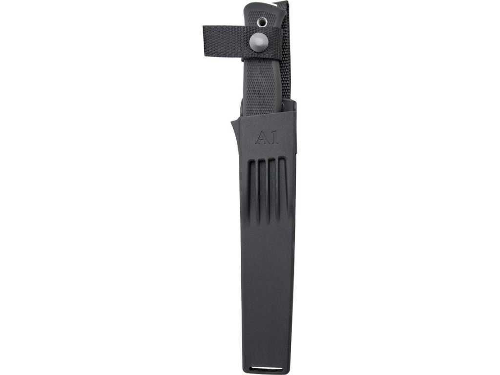 This left-handed A1 model has a laminated VG-10 stainless steel blade with a black finish. The blade is convex ground for an exceptionally strong cutting and piercing action. The Kraton handle is textured and provides a great grip in all conditions. The blade is slightly flared at the end for a more secure grip. The knife comes with a durable Zytel belt sheath.
