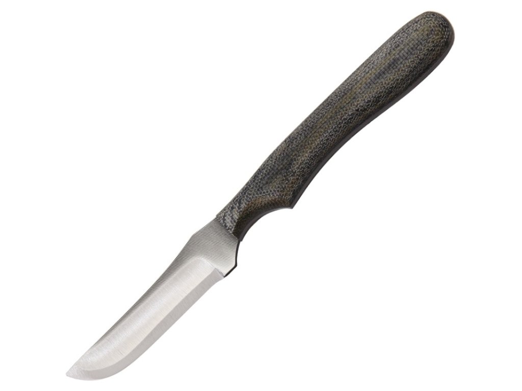 Celková délka 13,5 cm. Délka čepele 6 cm. Lovecký nůž. Leštěná čepel, rukojeť Micarta. Kožené pouzro.