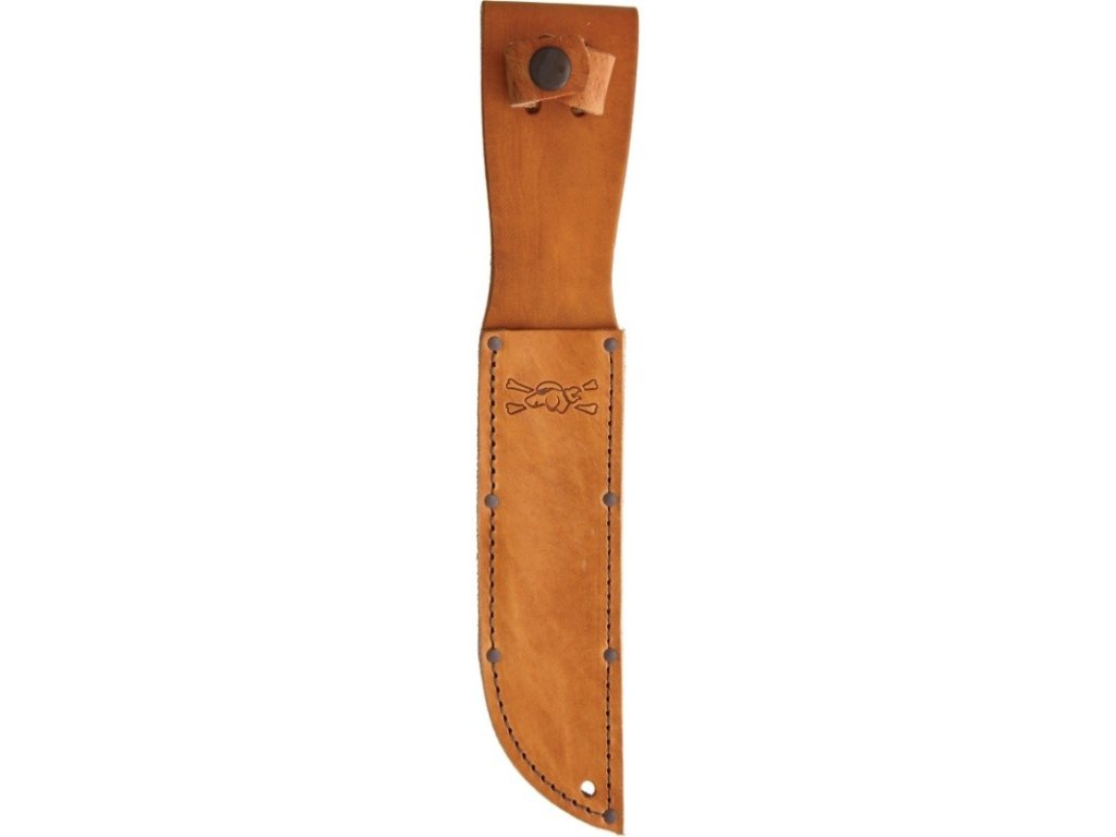 Brown leather sheath with belt clip. Dog logo embossed on blade and sheath.