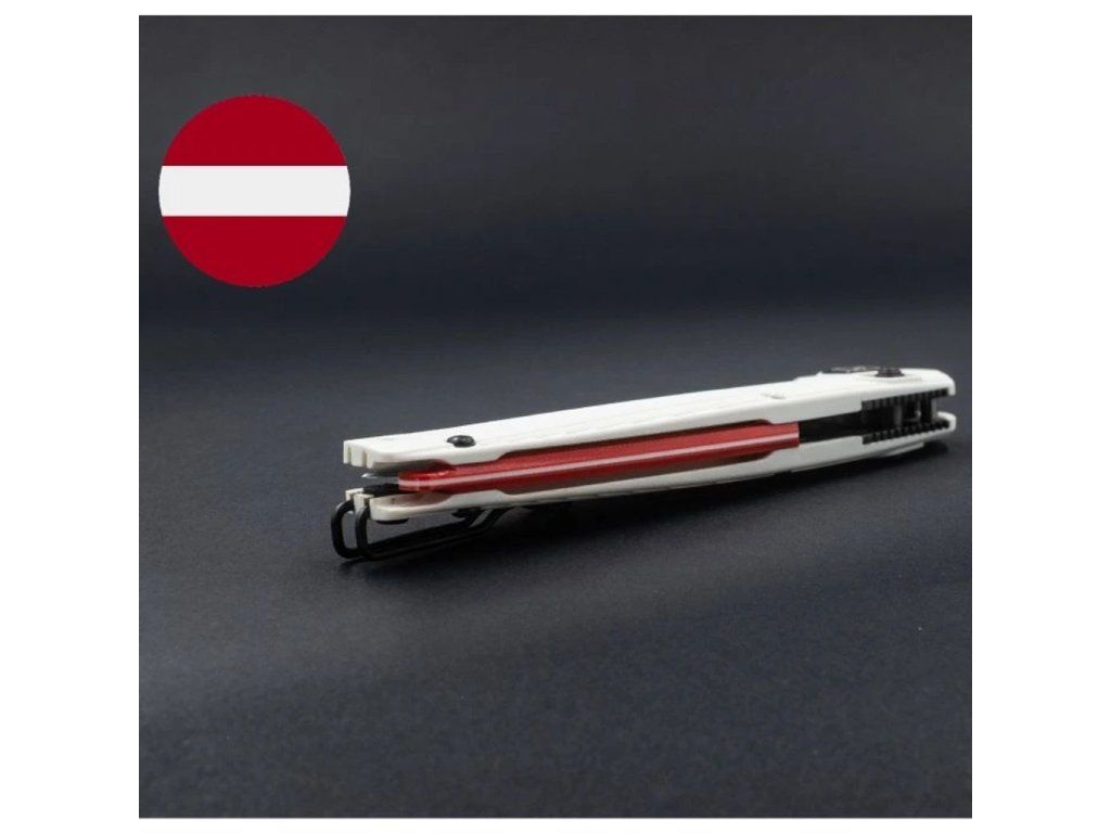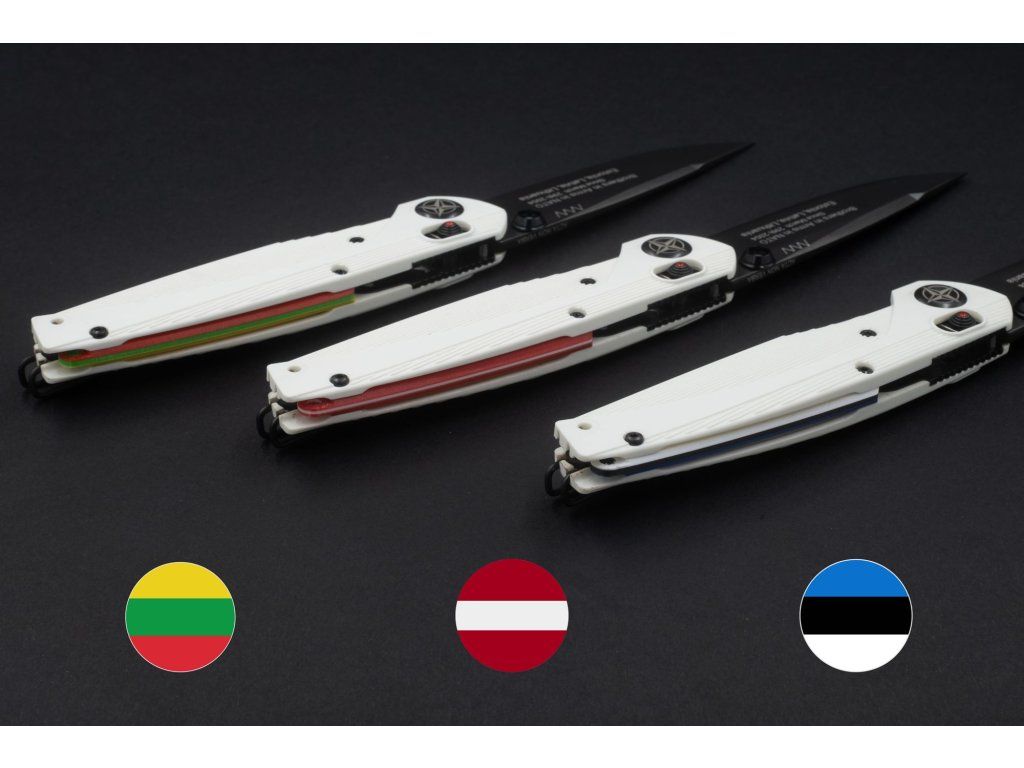 White scales made of lightweight and durable GRN material are complemented by backspacers in the colors of the national flags of Lithuania, Latvia, and Estonia.