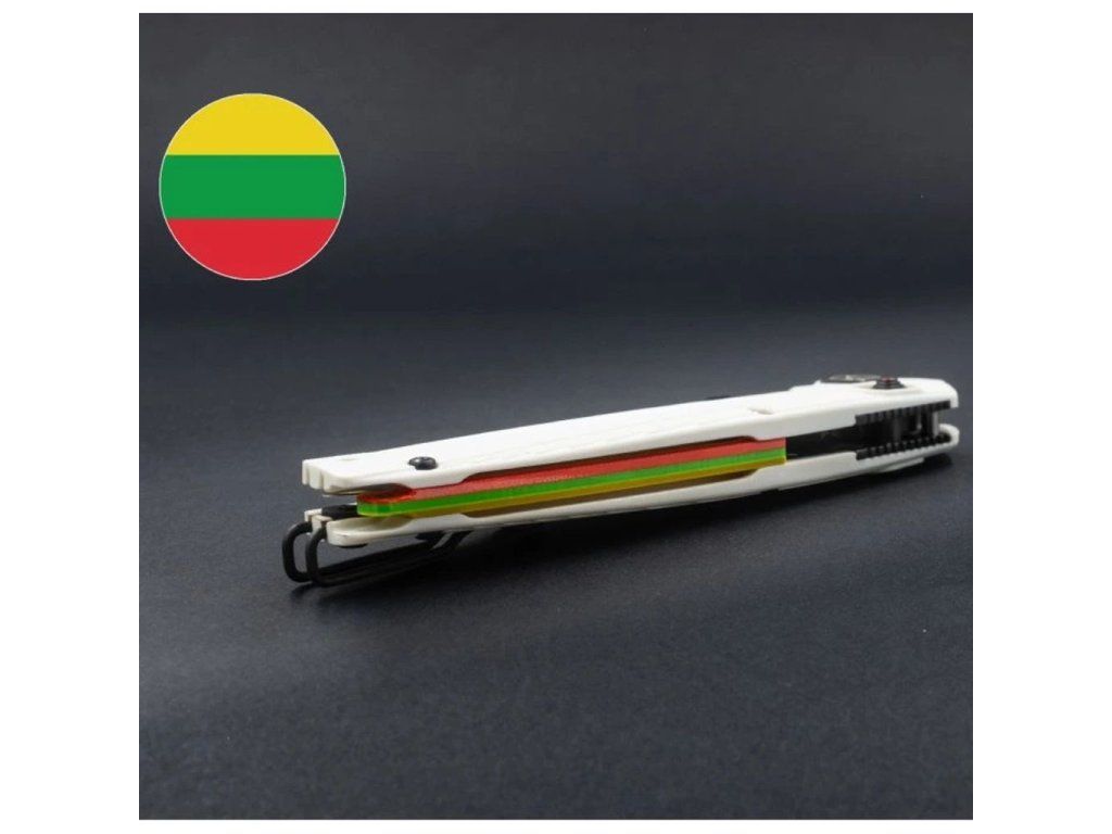 White scales made of lightweight and durable GRN material are complemented by backspacers in the colors of the national flags of Lithuania, Latvia, and Estonia.