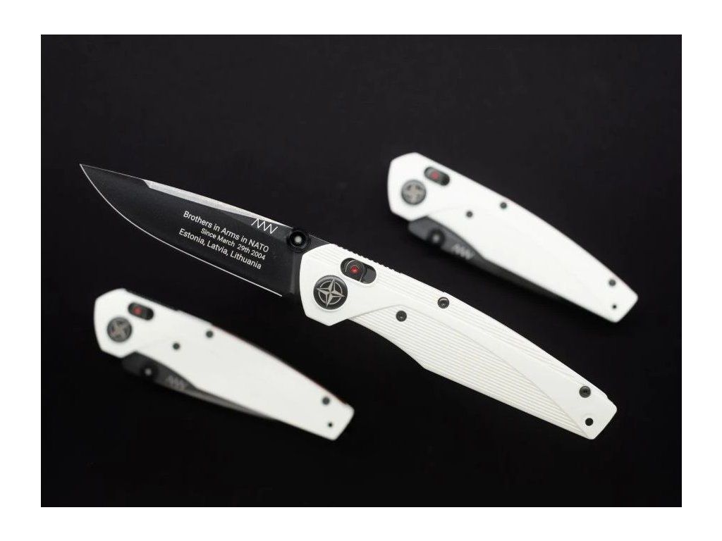 The Sandvik 14C28N stainless steel blade with a DLC coating features motifs referencing NATO accession, including the date March 29, 2004, symbols of the alliance’s unity, and a compass rose, which also appears on the knife’s pommel.