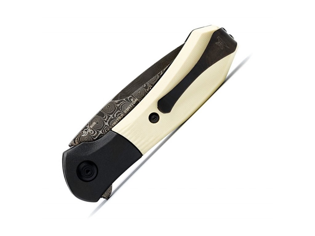 This limited edition Legacy Paradigm 590 knife features a beautiful damascus steel blade with a raindrop pattern and a sleek ivory-colored G10 handle with DLC-coated bolsters. It uses a flipper blade for quick and easy one-handed opening with ASAP assisted opening technology. Buck's Shift Mechanism provides a sturdy lock and prevents accidental opening.
