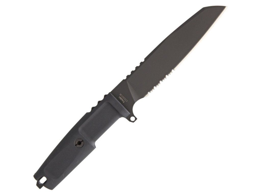 Black N690 stainless steel finish. Partially serrated blade. Integrated finger guard. Forprene handle. Lanyard hole. Nylon sheath.