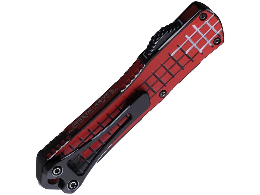 The Heretic Knives Manticore S is a compact automatic OTF knife (sliding out from the front of the handle) that combines clean design with high functionality.