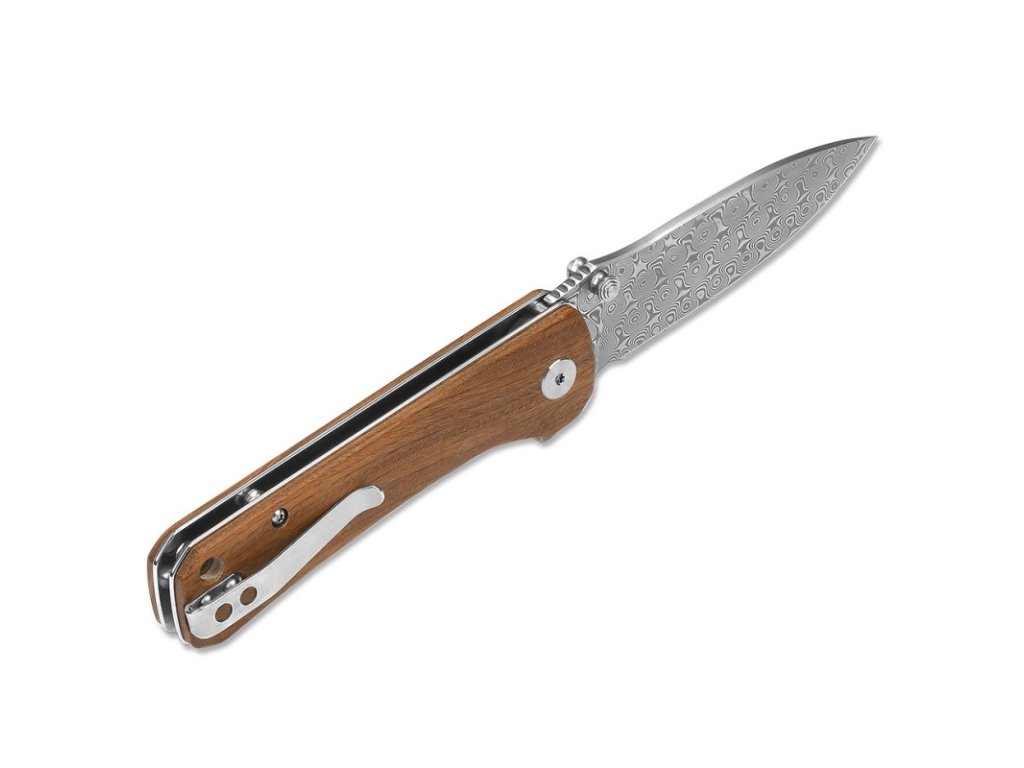 Elegant closing knife with damascus blade and blades made from exotic woods of South America.