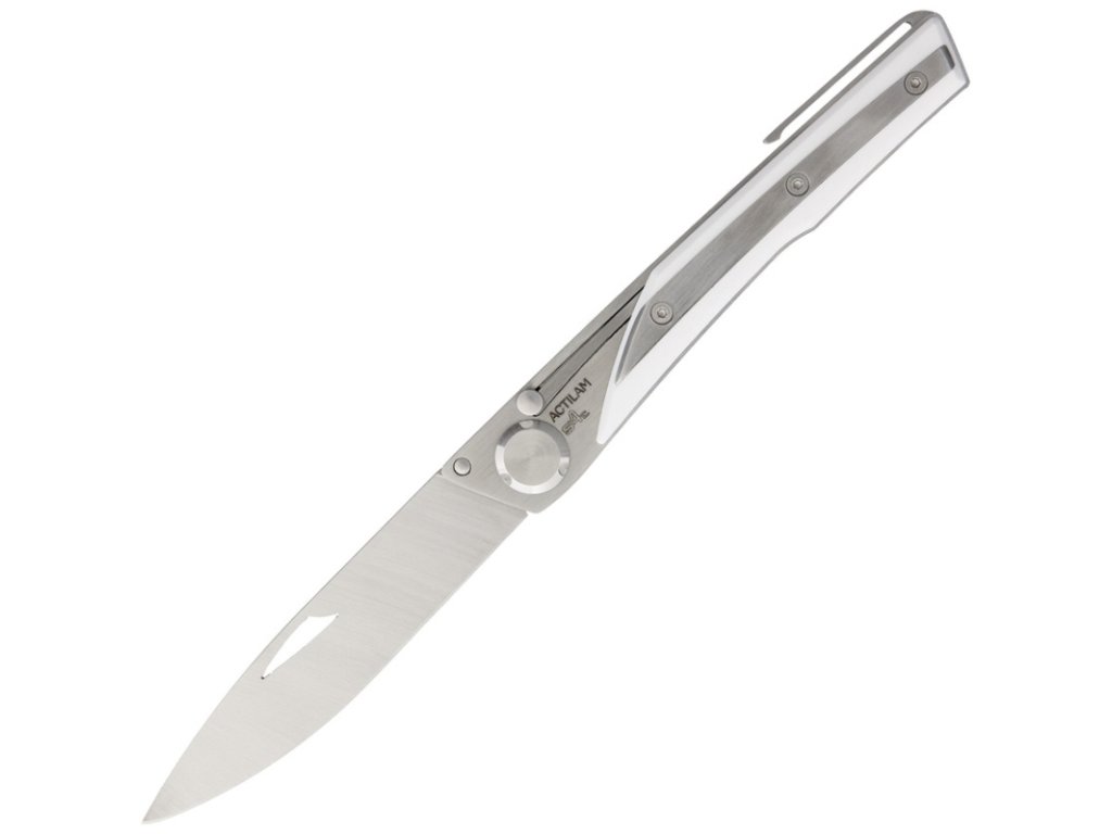 Length when closed 11,5 cm. Blade length 8,5 cm. Blade made of 14C28N steel, white Corian handle. With clip.