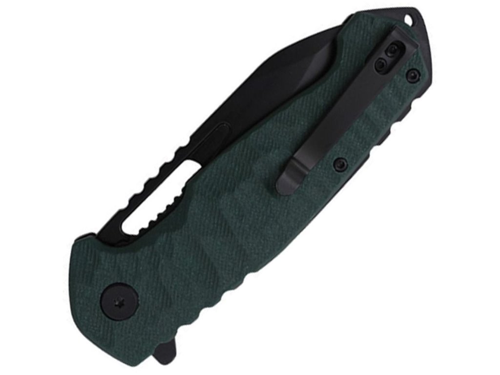The handle, made of durable G10 material in a green finish, offers a secure and comfortable grip even in more demanding conditions.
