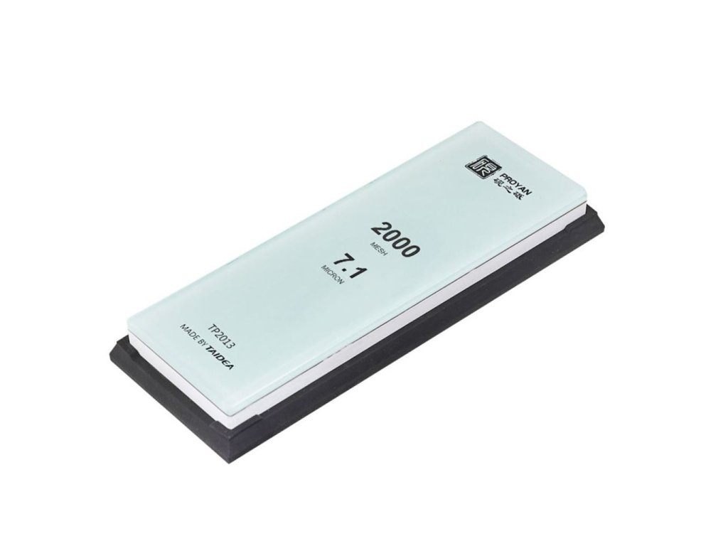 The Taidea Glass Proyan range of grinding stones contains white corundum, one of the hardest minerals in the world, and is combined with a tempered glass backing. This type of grinding stone diminishes much more slowly than conventional water stones, and there is no need to soak it in water before use (just splash it with water). The important factor is that you can use the grinding stone until the end, as the glass prevents the stone from being destroyed, even if there are a few millimetres of grinding material left on it.