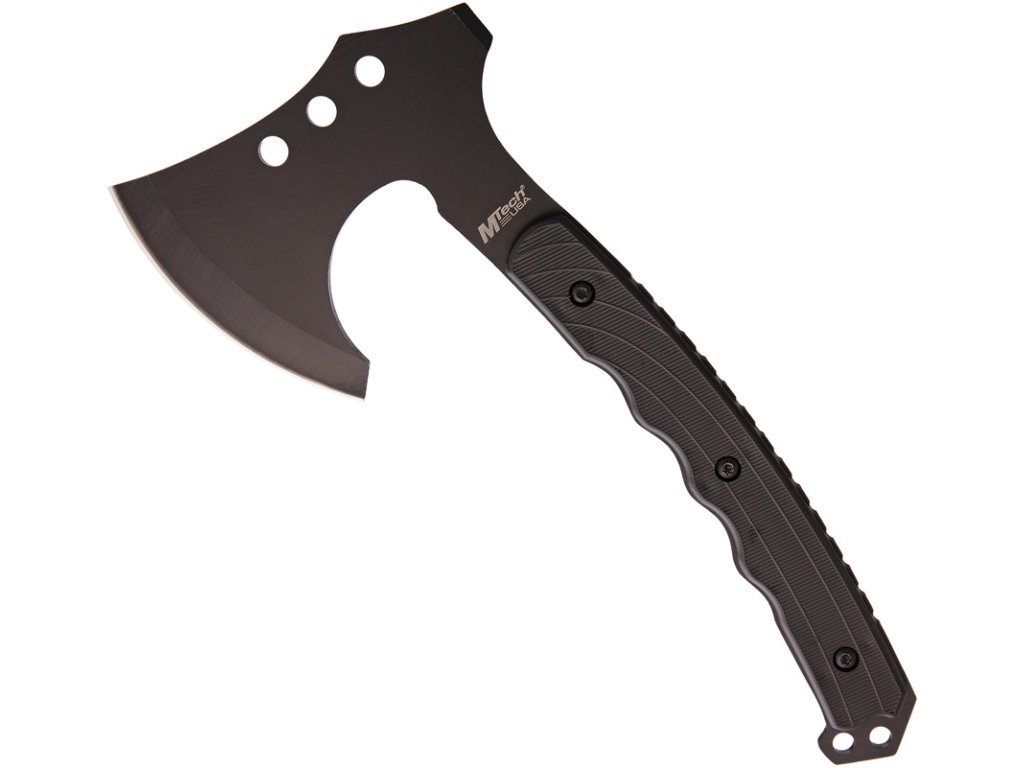 9.5" overall. 3.25" black finish stainless axe head with 4.5" cutting edge. Black textured synthetic handle. Full tang. Lanyard hole. Black nylon belt sheath.Additional parameters