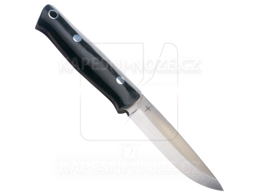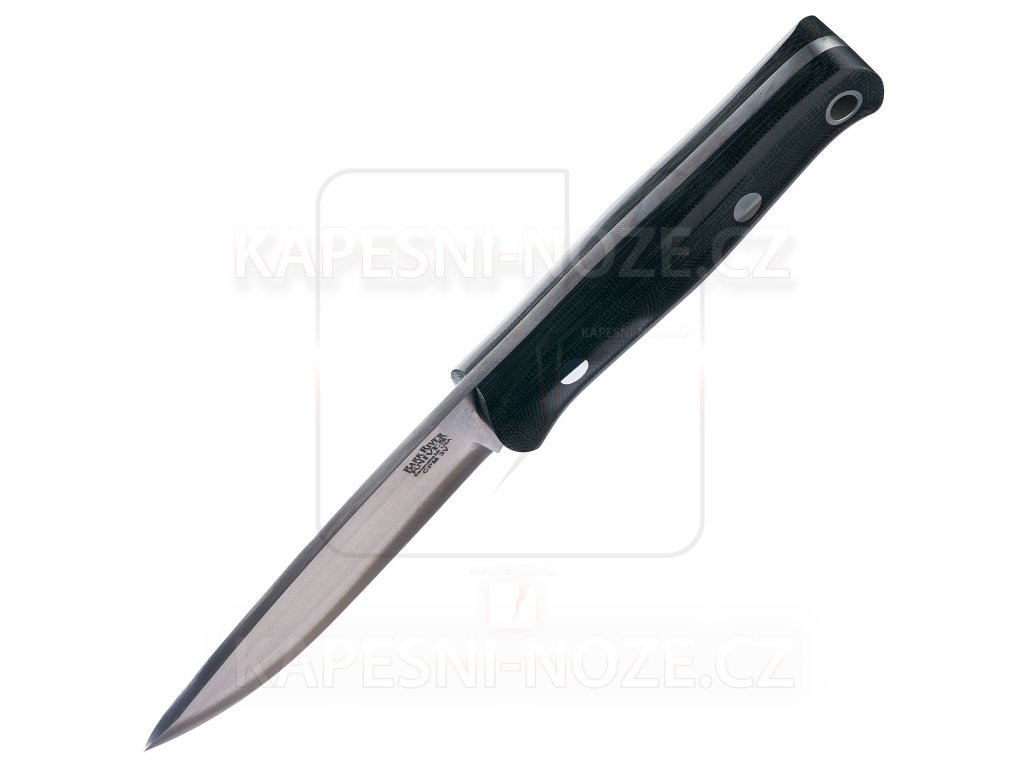 The handle is black canvas micarta with a shinny finish that provides a firm grip even in wet or dirty environments. This material resists moisture, extreme temperatures and mechanical stress. The ergonomic shape of the handle allows for prolonged use without excessive hand fatigue and makes it easy to control the movement of the knife.