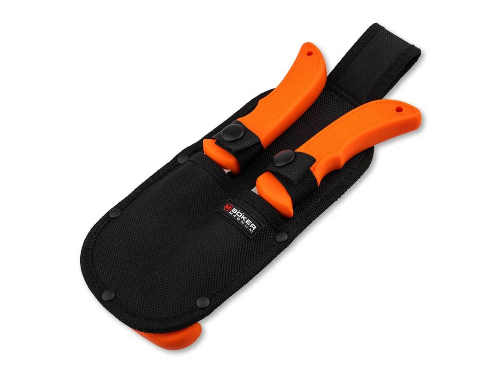 Magnum Hunting Line Game Set includes a Droppoint fixed utility knife, a Gutting Knife fixed wiener and a Processing Saw in a common nylon sheath with belt loop.