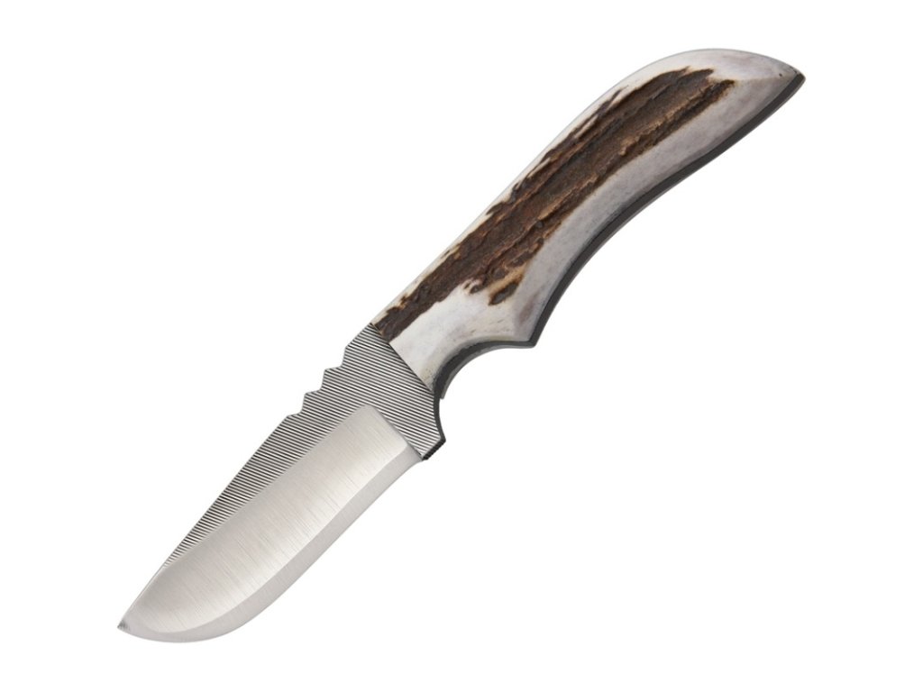 Overall length 19,5 cm. Length of blade 10 cm. Polished blade, elk antler handle. Brown leather sheath.