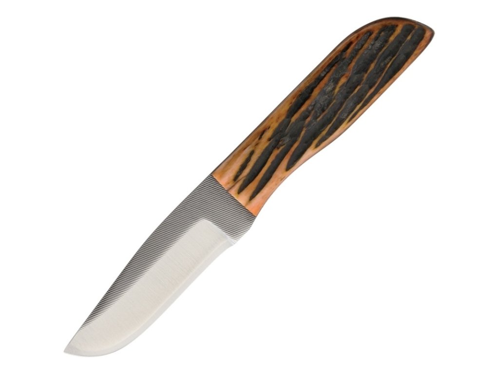 Total length 16 cm. Blade length 7,6 cm. Stainless steel blade, amber handle. Brown leather sheath.