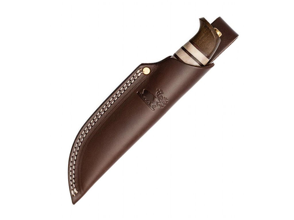 The knife comes in a genuine vegetable tanned brown leather sheath and features a reindeer print on the front.