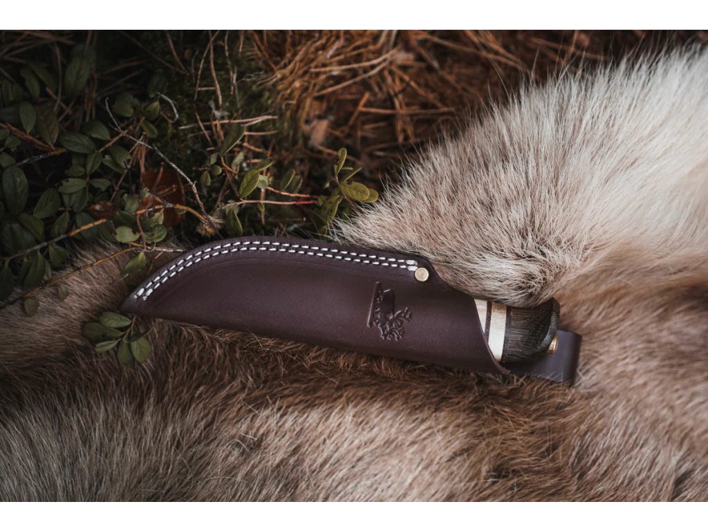 The knife features a 9 cm highly polished blade with a scandi grind made from our H3LS laminated steel. The composite handle has a dimensional belly made up of equal parts leather and reindeer antler inputs, framed by a front and back of dark oak. The shape is reminiscent of a classic Norwegian outdoor knife, ideal for most things you need a knife for when you're either going on a Sunday hike or a longer adventure.
