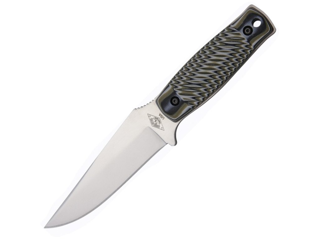 Total length 23 cm. Blade length 12,7 cm. Blade made of D2 tool steel. Handle green-brown G-10 with lanyard hole. Black nylon clasp sheath.
