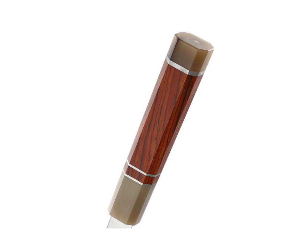 This knife is handmade by highly skilled craftsmen with decades of experience in handcrafting knives. The blade is Sandvik 14C28N steel with a hand satin finish. The fine convex grinding of the blade produces a nice arcuate shape and exceptionally sharp performance. The handle is all hand polished, using rosewood and buffalo horn, bonded with nickel silver. With its elegant design, a full tang texture is used throughout to achieve the best balance and longest life in use.