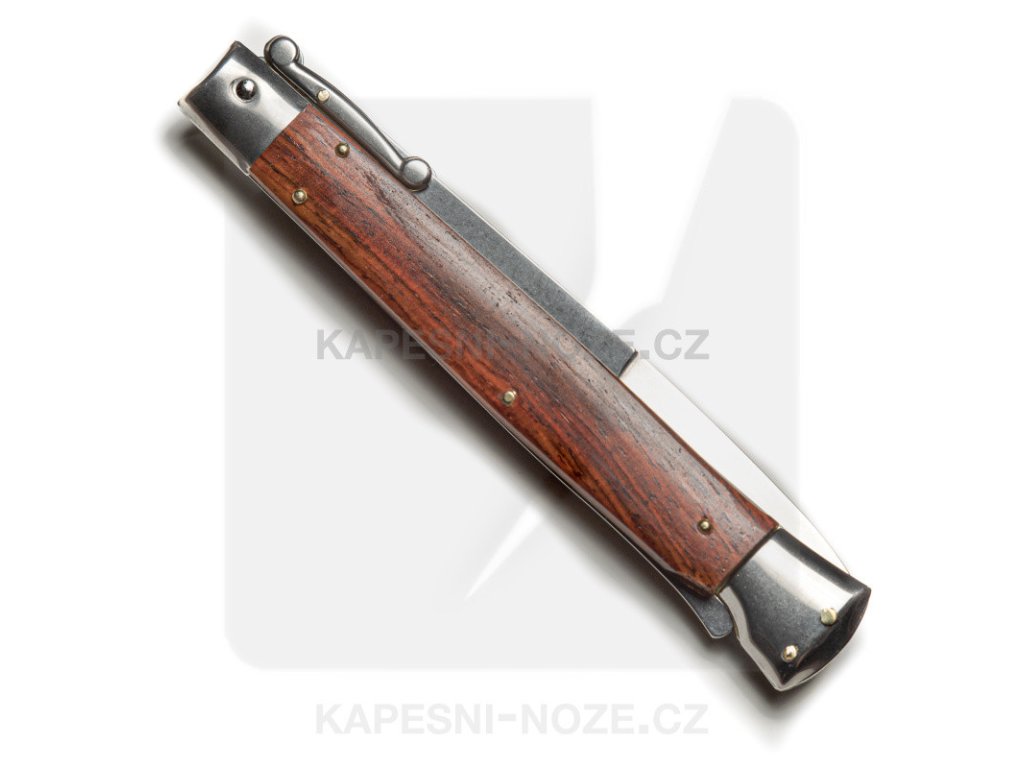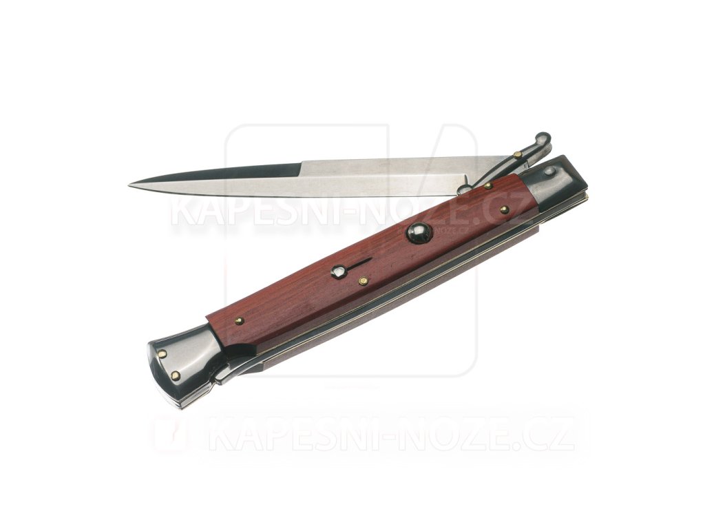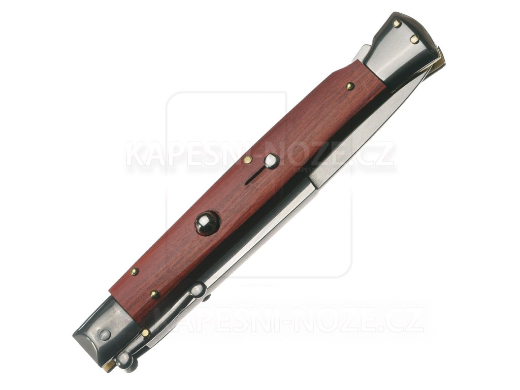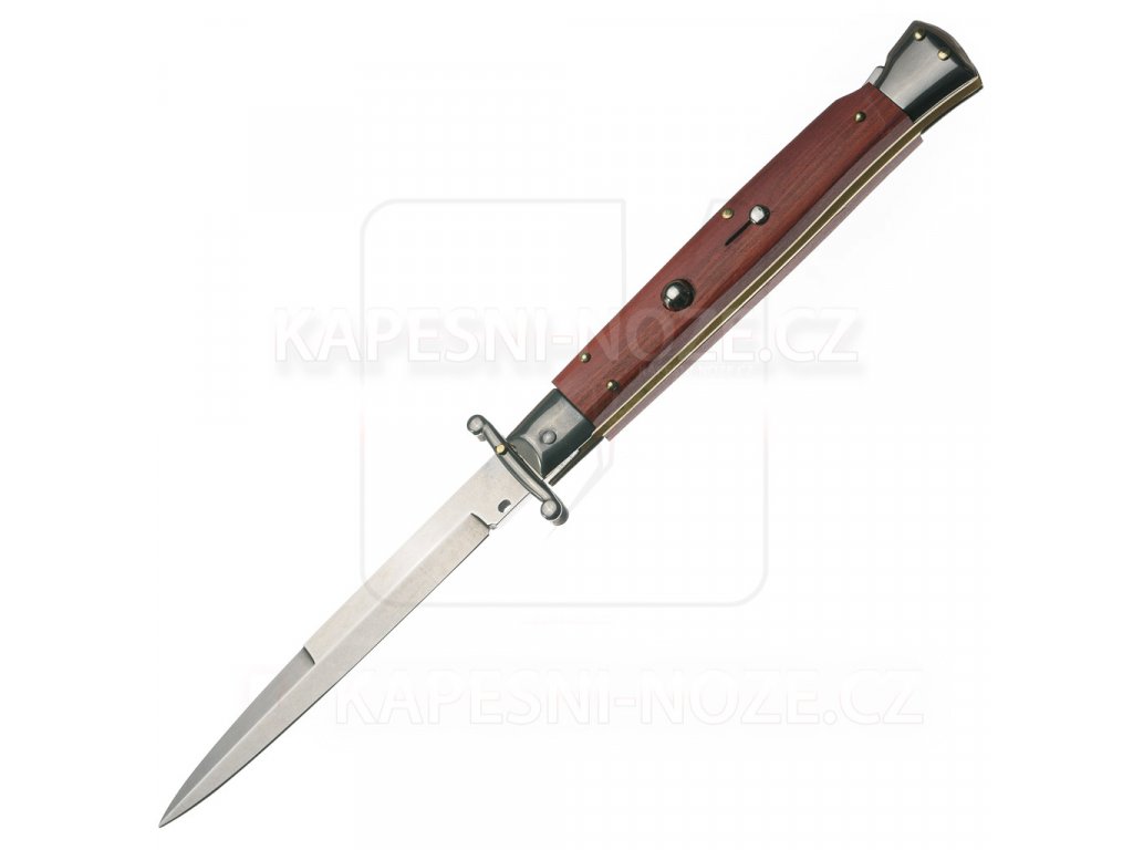 A unique traditional stiletto inspired by the original Frank Beltrame Italy switchblades. Here the manufacturer has eliminated and improved certain manufacturing flaws, making it a reliable and accurate knife in terms of blade release and robustness in the open position. The switchblade guard is attached to the blade with a small rivet, the inserts made of brass and the blade made of AISI 420 MA5M stainless steel with a hardness of 56 HRC.