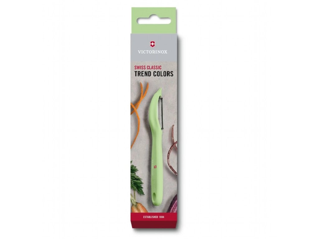 Universal Swiss-made peeler with ergonomic handle and potato mesh remover. The blade is made of carbon stainless steel. Dishwasher safe