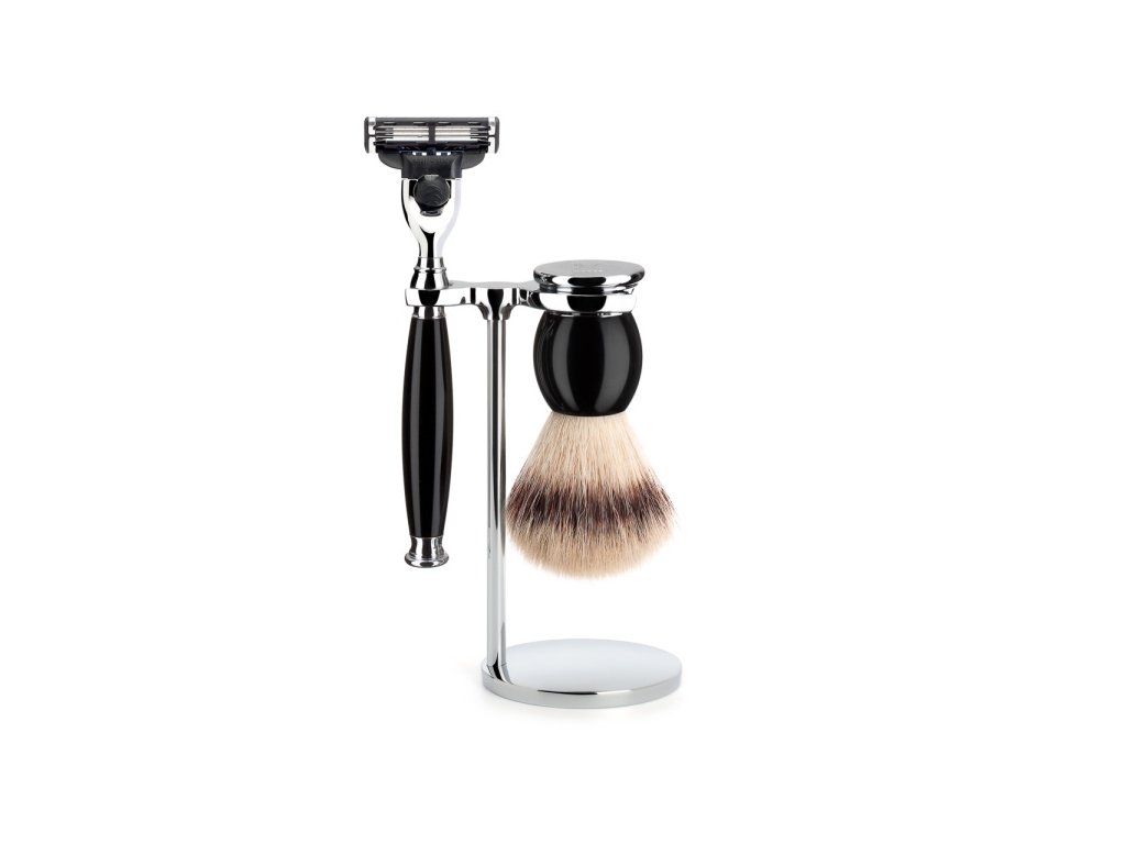 3-piece shaving set, without bowl, Edelharz handle - Silvertip Fibre shaving brush, size L, head diameter 23 mm - Gillette Mach 3 blade - metal stand, chrome-plated High-quality resin is a premium synthetic material that is ideal for exclusive accessories, stationery, etc., as it allows for a wide range of modern and classic designs in many attractive colours. Production starts with aesthetically basic shapes and these are then carefully crafted for brushes and machines. Each individual piece is gradually polished until it gives the surface its special flash. This processing gives the models a pleasing feel and ensures their beauty for many years to come. Without chrome, the world would lose much of its lustre, which is why we use it for our shaving products and it demonstrates its best qualities here too. The products are corrosion-resistant, have a very long service life and have a luxurious appearance. When contrasted with other premium materials, their colours and shapes create the perfect piece of work. High-quality synthetic fibres are the first of our world inventions. We offer synthetically made top quality, whose properties are very similar to those of expensive natural badger bristles. Most users even claim that this quality actually provides better performance characteristics than natural materials. Silvertip Fibre® is very soft at the tip, but somewhat more stable in the middle compared to natural bristles. These properties create a nice, soft feel on the skin when the foam is applied. For everyday use, these bristles are less sensitive compared to natural bristles because they dry faster and resist shaving soaps and creams better. Completely vegan fibers are also somewhat easier to use than natural fibers because they produce a particularly creamy and thick lather from a small amount of shaving soap or cream. The semi-circular shape of the shaving brush head is ideally adjusted by hand. The fine tips therefore do not require trimming and the natural softness of the fibres is preserved. Shaving head - Gillette Mach 3 Worldwide, Gillette-Mach3 is the most widely used of the shaving systems. Three consecutive razor blades ensure a close and smooth shave. The razor blades are widely available on the world market. Mühle products are compatible with the Gillette Mach3 and Mach3 Turbo systems.Be the first who will post an article to this item!